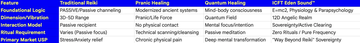 The positioning of ICFT Eden Sound™ as being "way beyond Reiki" is not merely a marketing hook; it is a structural differentiation based on frequency dimensionality and methodology.cWhile Reiki is often marketed as a passive, hands-on technique focusing on the 3rd through 5th dimensions, ICFT operates on the 12th dimensional (12D) Angelic realm.