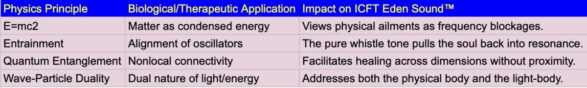 The efficacy of ICFT Eden Sound™ at an interdimensional level relies on the principles of quantum entanglement and nonlocal consciousness. Entanglement describes a state where particles remain connected, such that the state of one instantly influences the other, regardless of distance. This allows the practitioner to bridge the gap between the physical body of the client and the higher-dimensional templates of the soul.