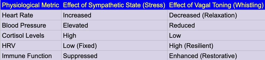 Heart Rate Variability (HRV): Whistling and rhythmic breathing exercises the vagus nerve, increasing HRV—a key metric for resilience and stress recovery.