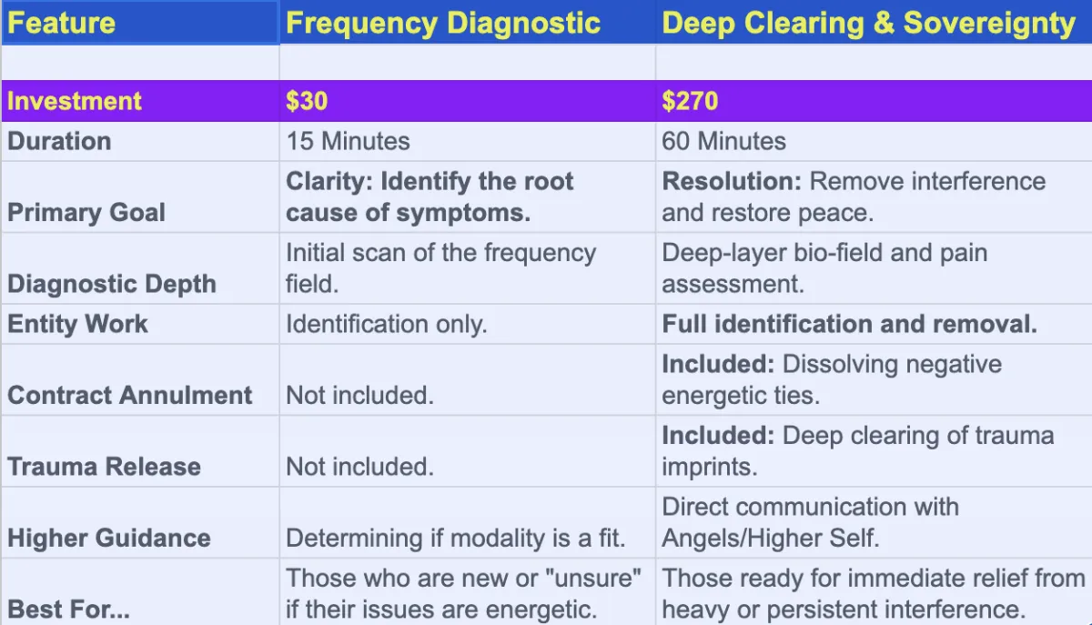 Choose the 1-Hour Deep Clearing if you are ready to reclaim your life. This is for those dealing with persistent negative thoughts, feeling "attached" to something, or struggling with deep trauma that refuses to budge.